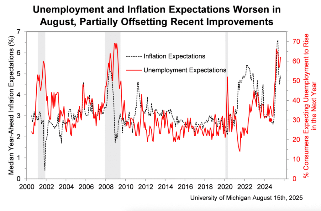 - Consumer sentiment weakens. The University of Michigan index dropped to 58.6 in August, while one-year inflation expectations climbed to 4.9%.