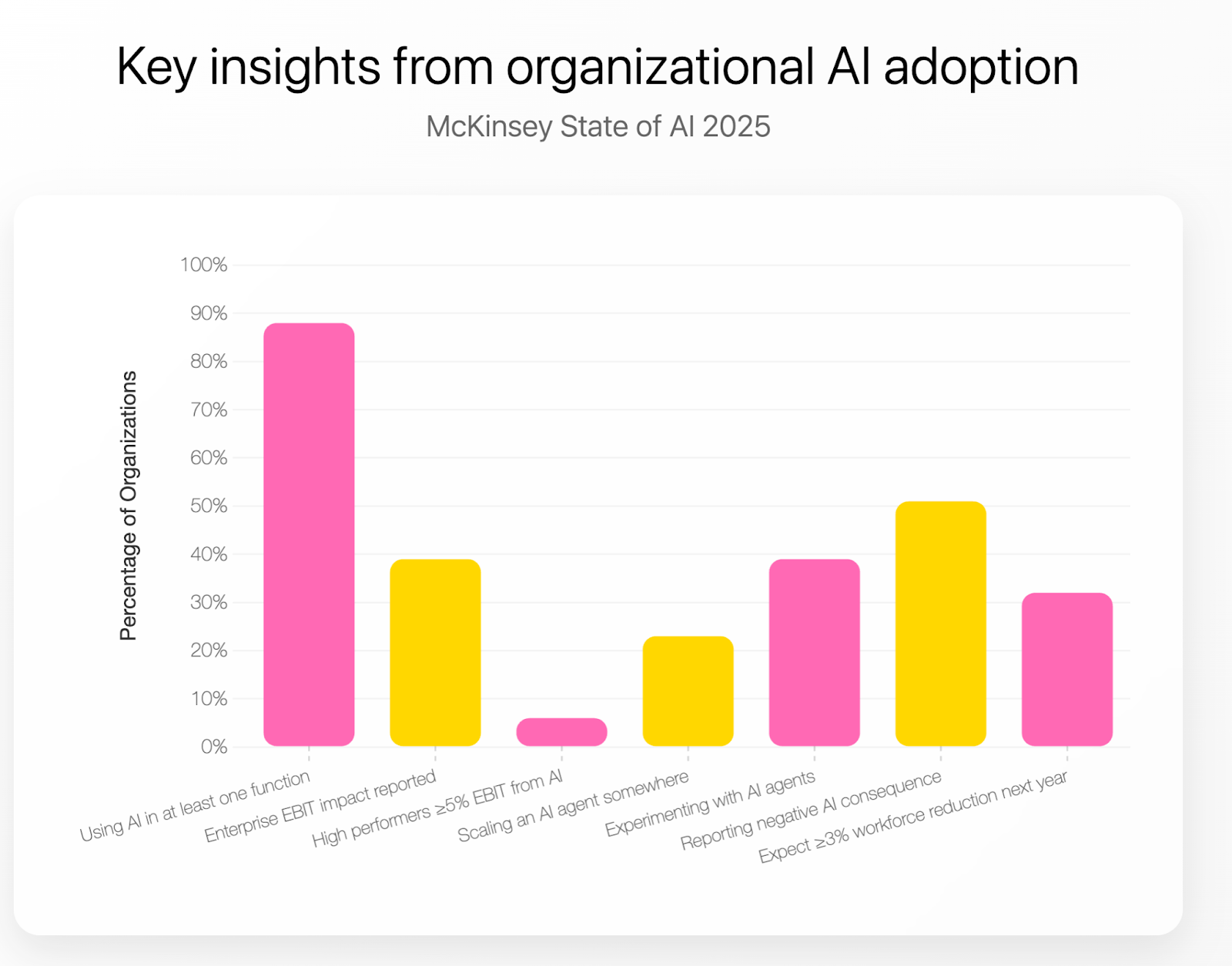 Agents are real but still thin in any one department. McKinsey finds 62% of businesses are experimenting with agents and 23% scaling at least one agent somewhere. In a given function, fewer than 10% have agents at scale.