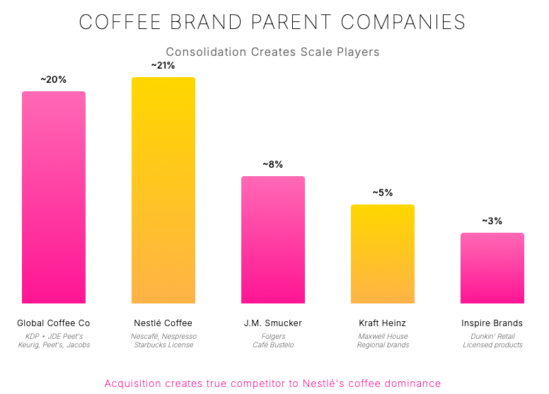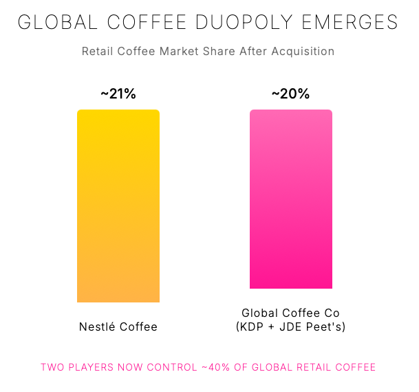 Keurig Dr Pepper buying JDE Peet’s concentrates power at the top of retail coffee. Two groups now sit on roughly forty percent of global coffee sold at retail. That reshapes buyer negotiations, trade terms, and how quickly new formats go national.